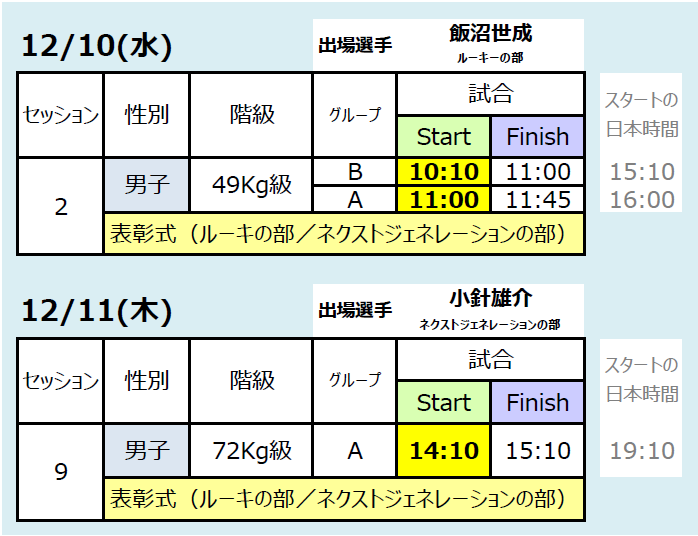 日本の2選手出場スケジュール (2025.12.7 更新)