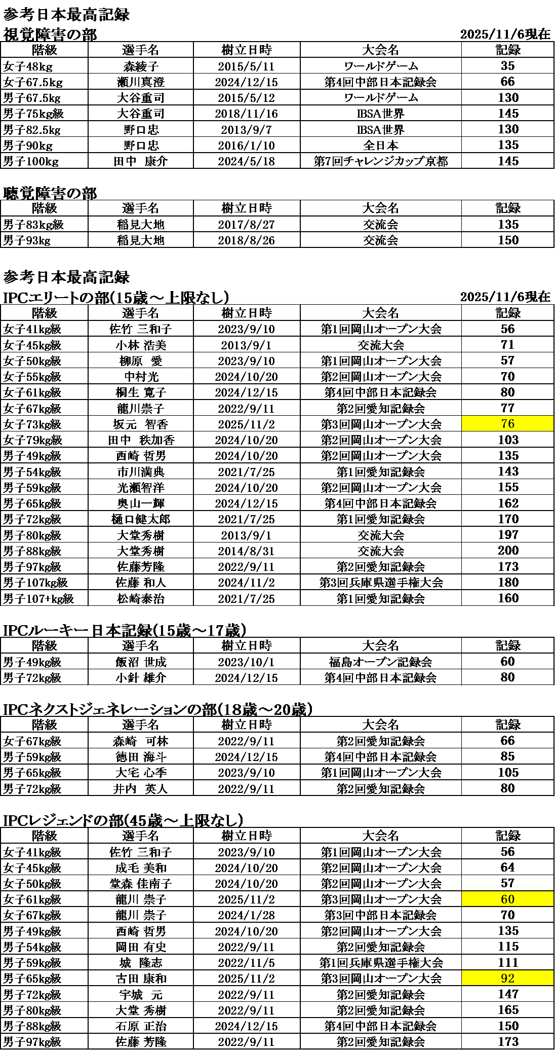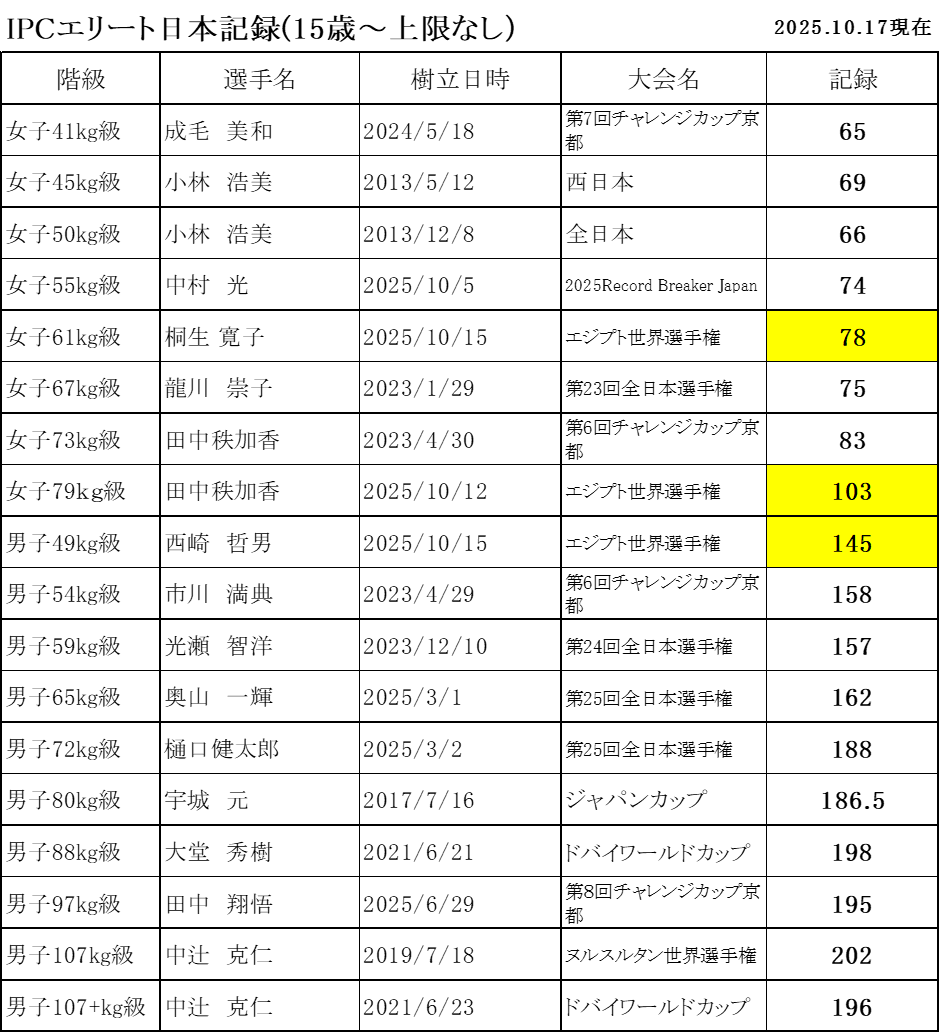 トータル記録の日本新を含めた、日本新一覧表はこちら:IPC登録_日本新_1017.pdf