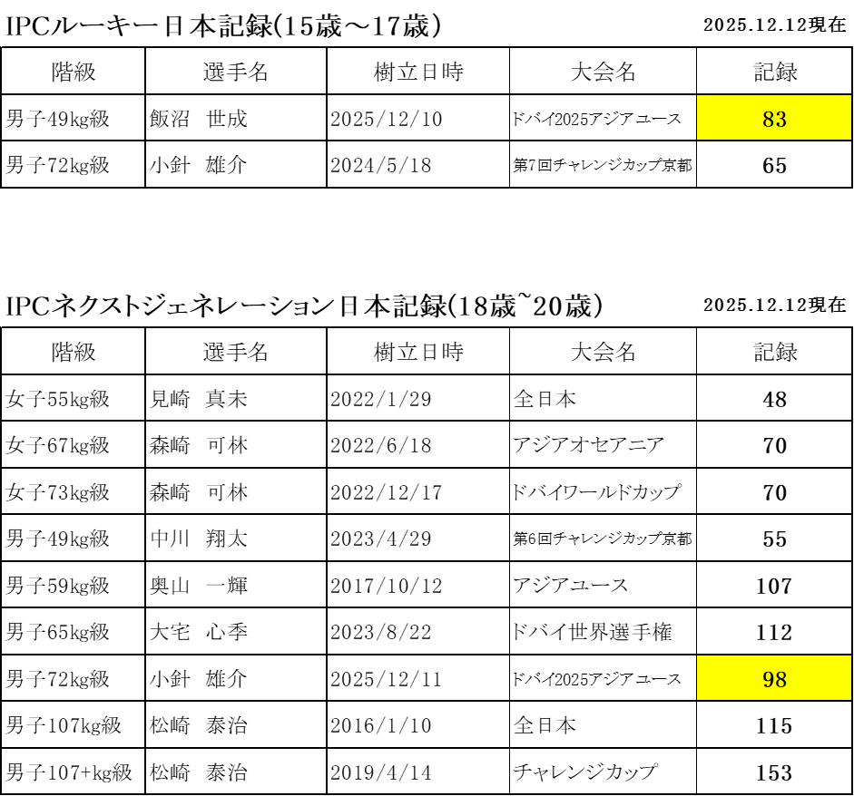 トータル記録の日本新を含めた、日本新一覧表はこちら:IPC登録_日本新_1212.pdf